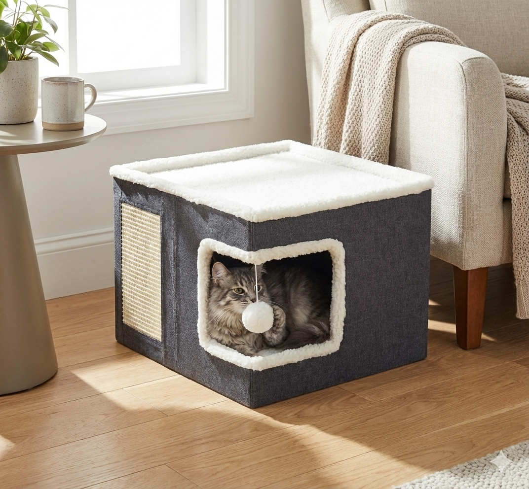 Cloud Haven™ is built with structure and softness in mind. The sturdy felt walls maintain shape while remaining gentle to the touch, offering both stability and comfort. The lamb cashmere lining wraps your cat in warmth, while the breathable exterior ensures proper ventilation. A built-in scratch pad and dangling play ball transform this cabin from a simple bed into an engaging environment your cat will love.